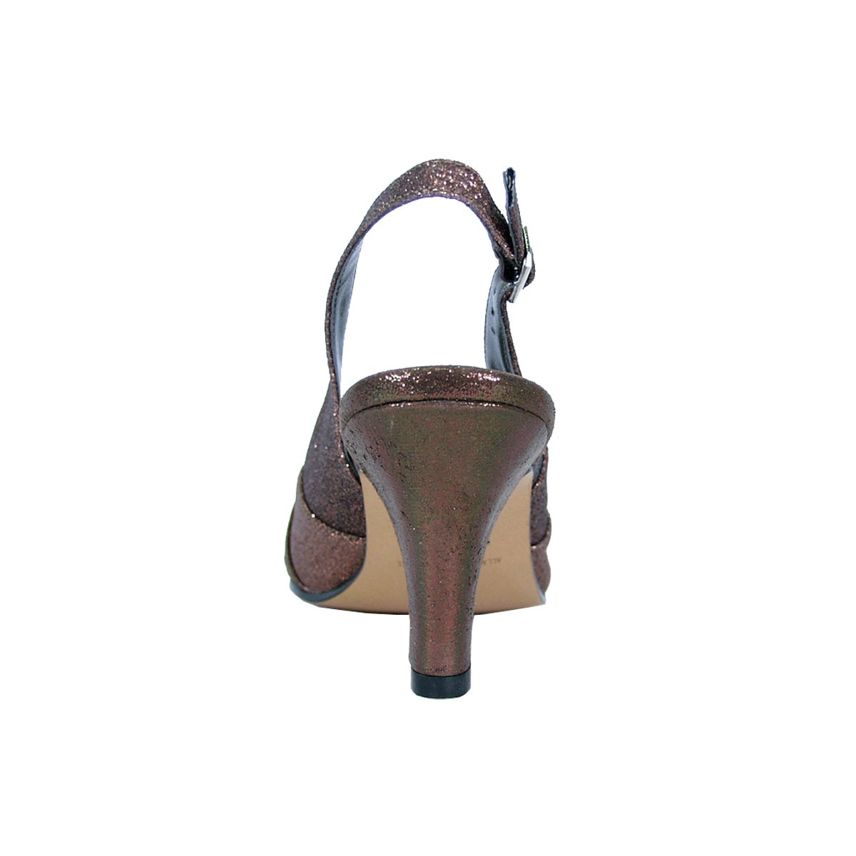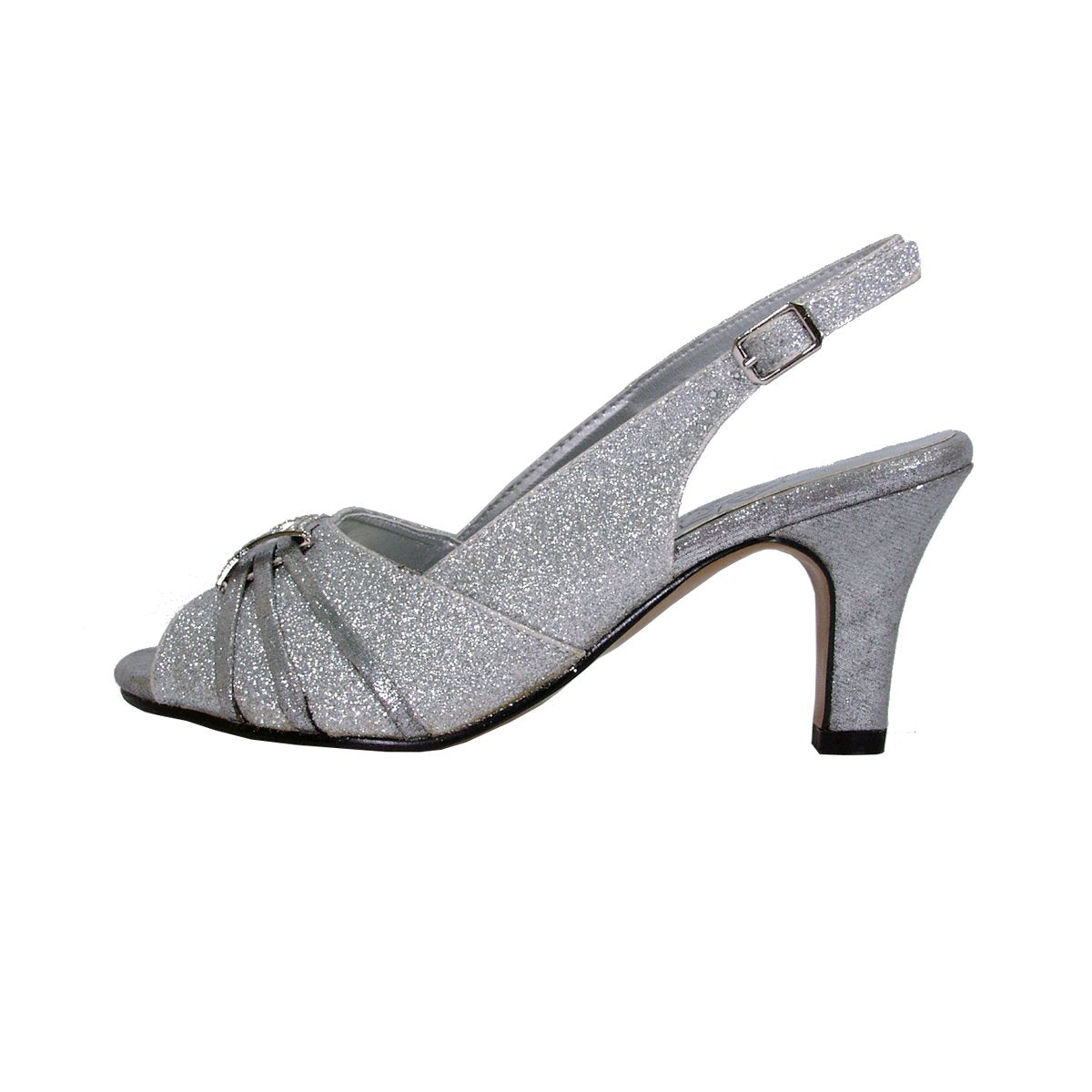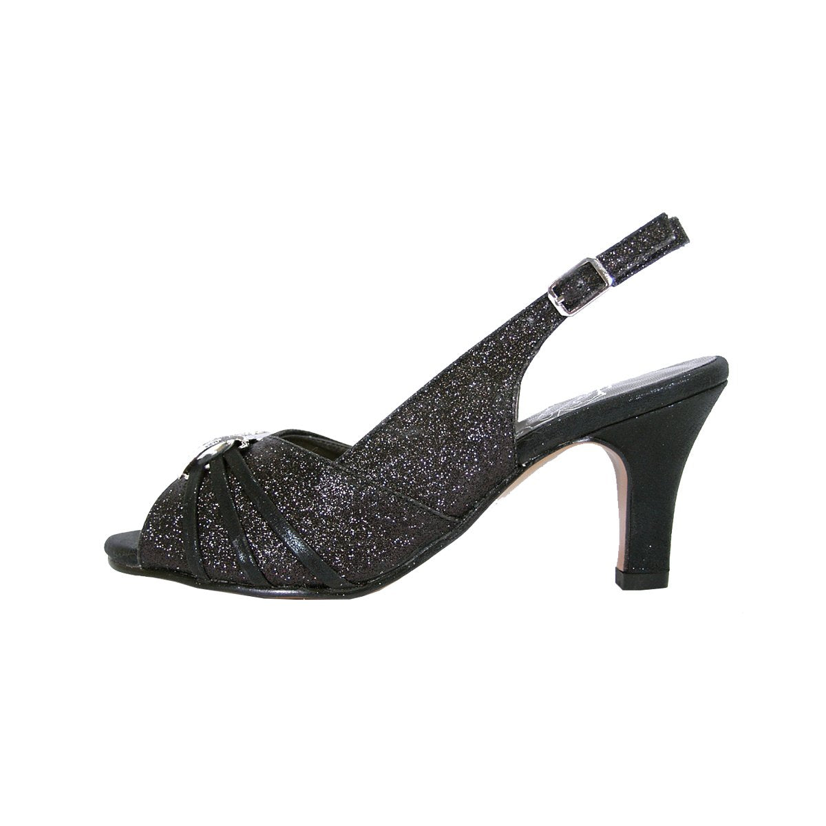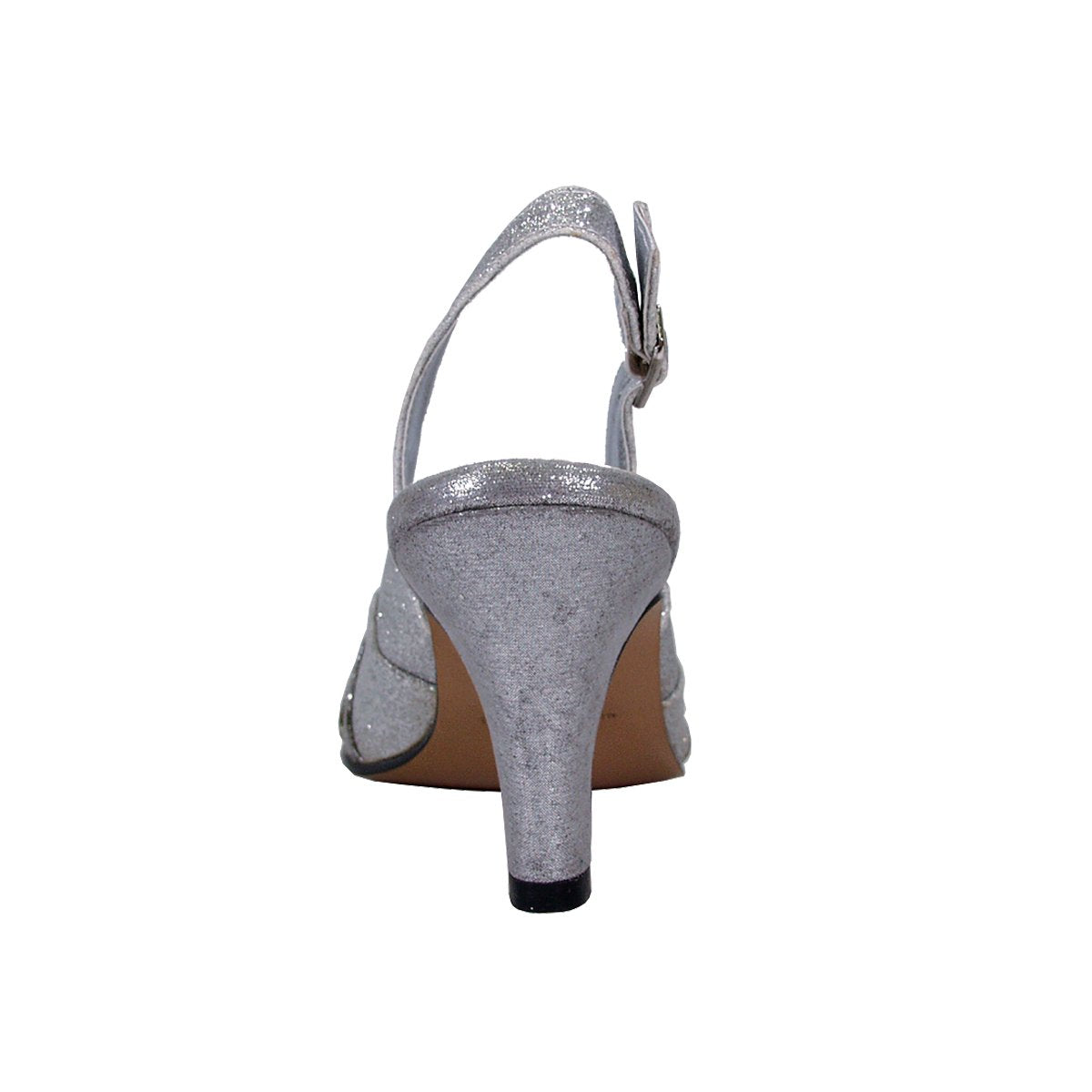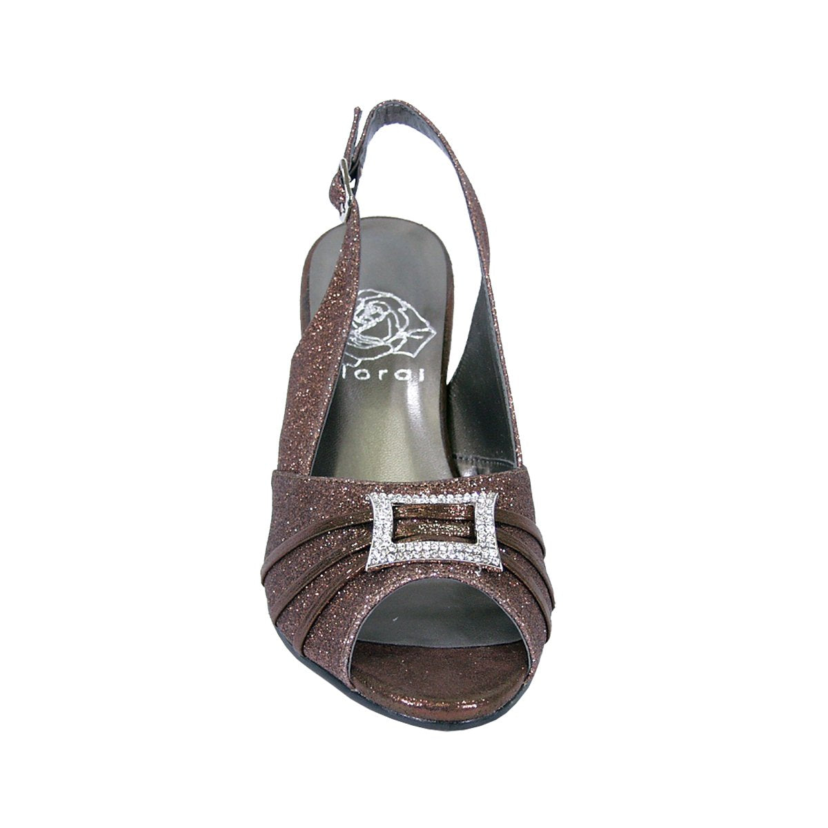 FLORAL Nadine women’s extra wide width peep toe dress slingback pump complements well with any formal or fancy ensemble. This classic ladies high heel shoe with decorative rhinestones and PU stripped toe cap on a synthetic glitter upper creates a design combination that is timeless.