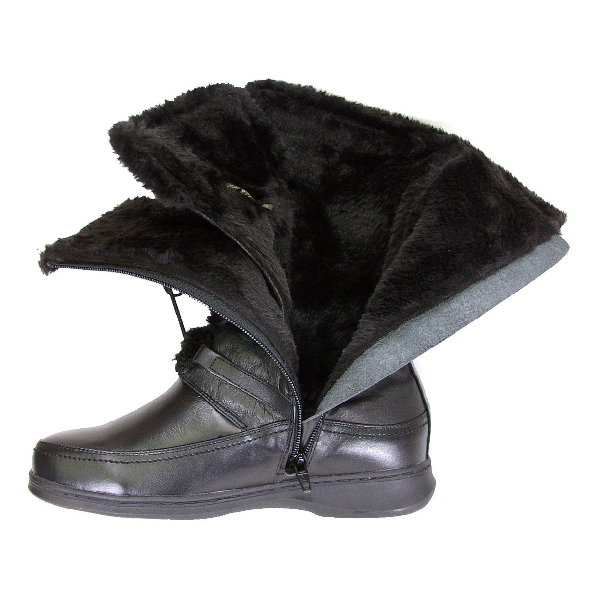 PEERAGE Joan women’s extra wide width 11″ shaft height leather boot for falling temperatures. This ladies 1″ low-heel mid-calf boot features an inner fleece lining, adjustable front lace, side zipper closure, and rubber outsole. It is the perfect choice for your cool-weather attire.